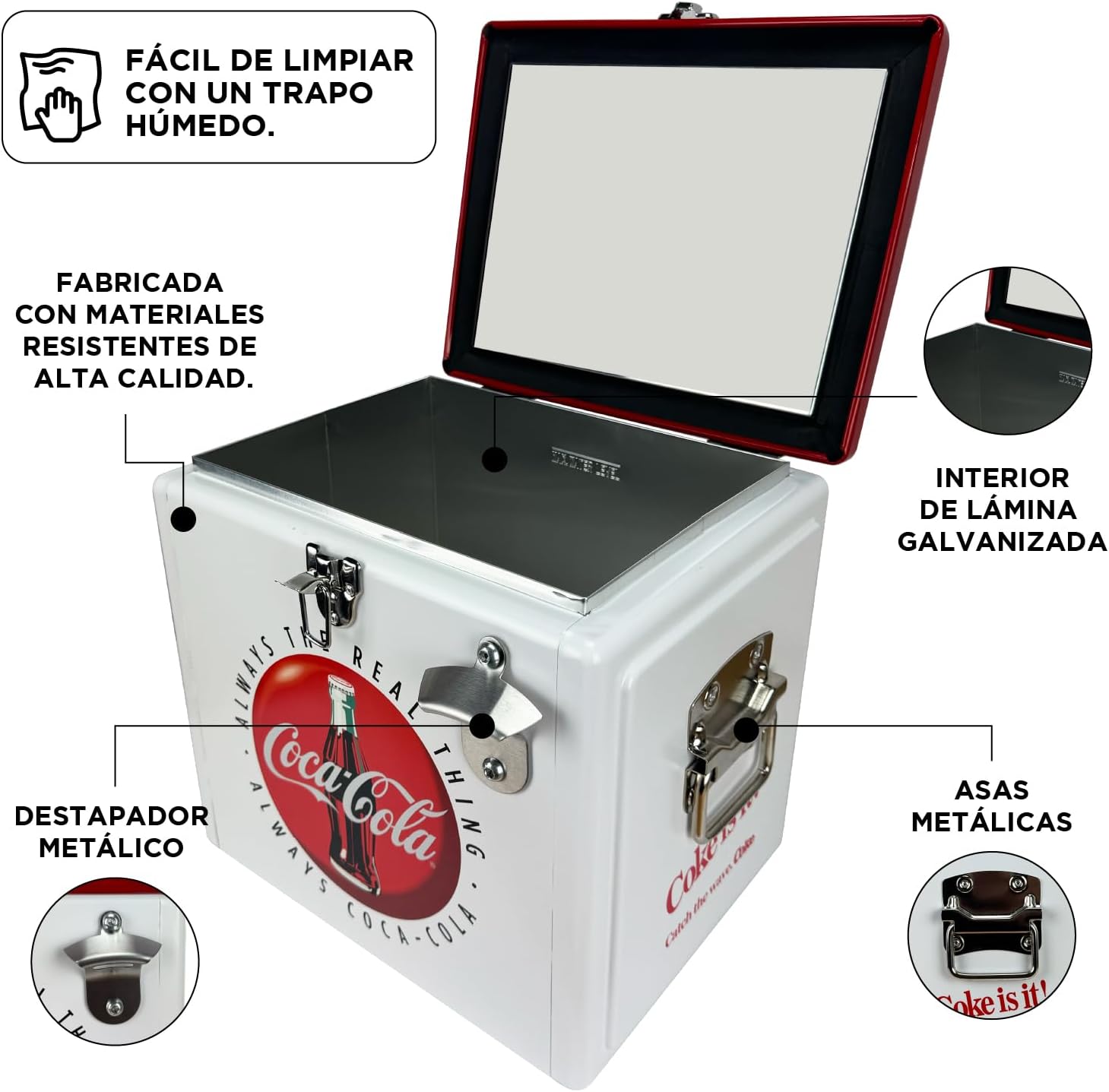 Rompe con lo convencional. Esta hielera Coca-Cola, con su diseño Blanco y Rojo de alto contraste, ofrece una estética vintage refrescante que ilumina cualquier espacio. Es el accesorio perfecto para complementar tu cocina, tu bar en casa o cualquier evento al aire libre con un toque de distinción.