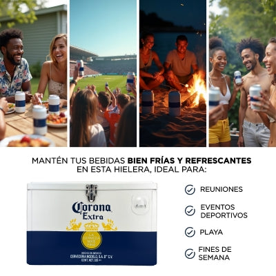 Conserva tus bebidas frías hasta por 24 horas con esta hielera metálica Corona de 20L. Estilo vintage, calidad superior y todo lo que necesitas para disfrutar sin preocupaciones.