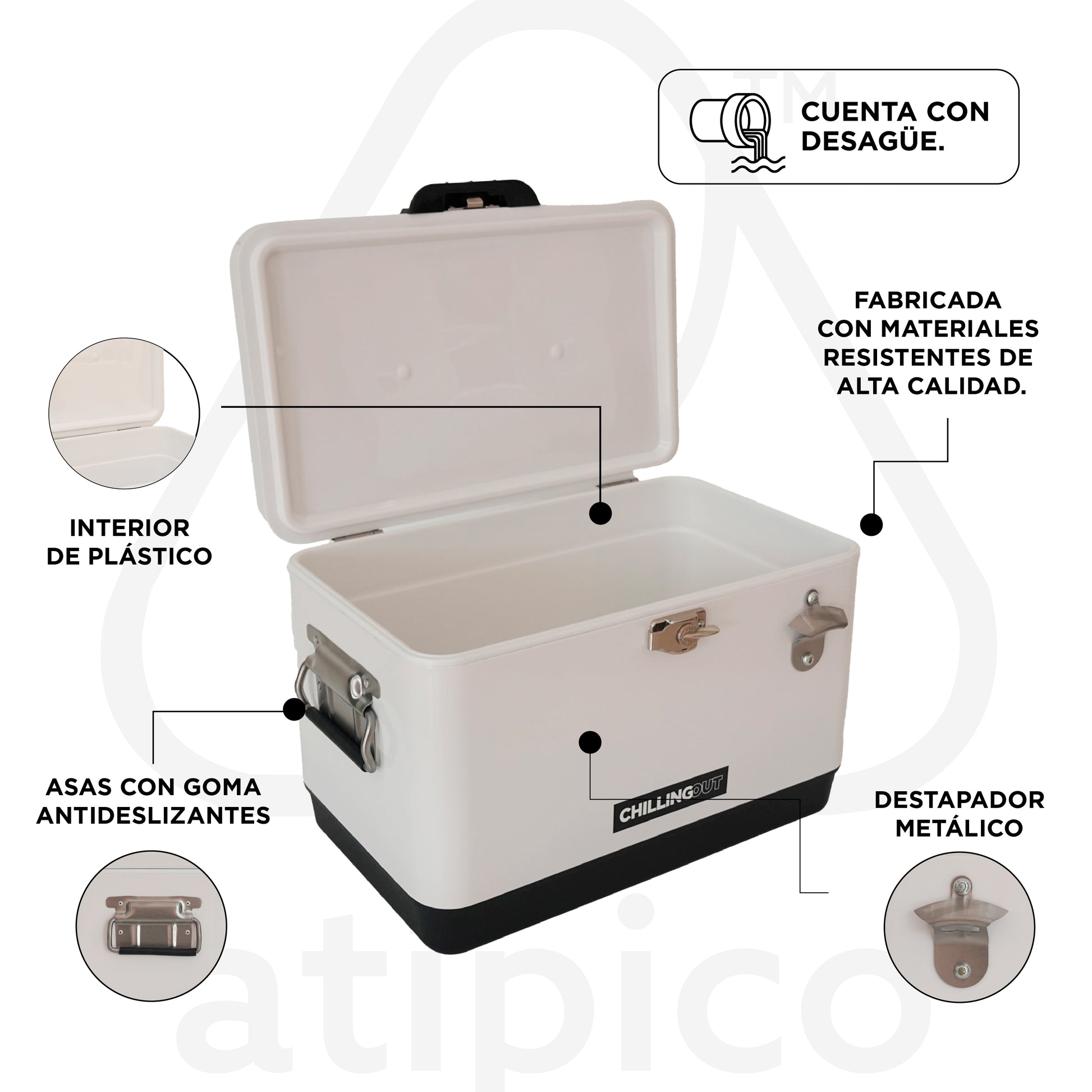 Refresca tus momentos con estilo con la Hielera Metálica ChillingOut Blanca de 30 litros, un diseño elegante y duradero que mantiene tus bebidas frías hasta por 24 horas. Perfecta para tus escapadas, reuniones o días de descanso al aire libre.